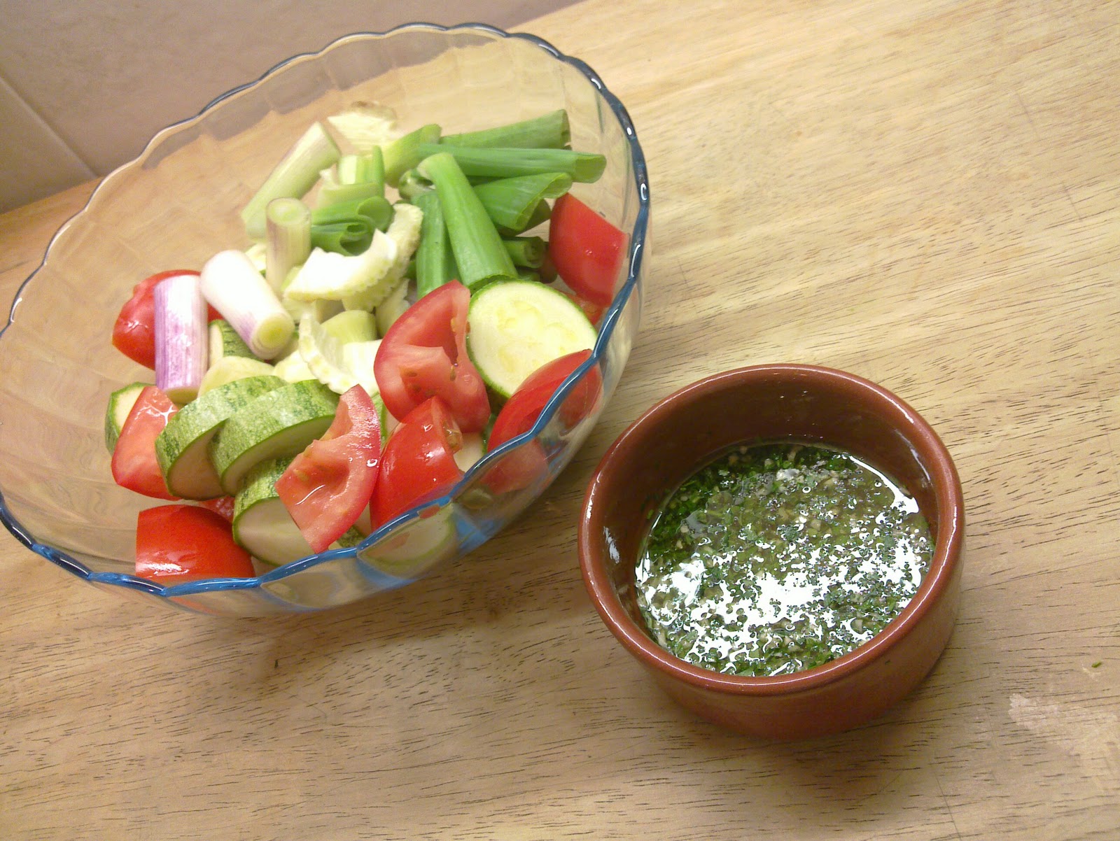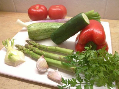1. La preparación es muy sencilla. Se limpian y se trozan todas las verduras de un tamaño similar. El zuchini y el pepino, en rodajas. Los tomates, en cuartos y sin semillas. Los espárragos y la cebolla de verdeo en cabos de 4 centímetros. Se hace la provenzal.
