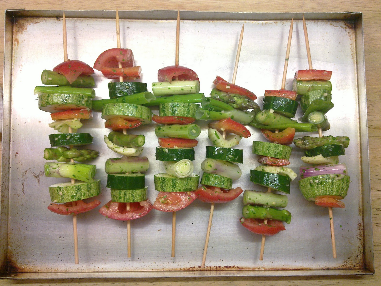 3. Con los palillos de brochetas se intercalan al gusto y de manera aleatoria todas la verduras, formando de esta manera las tan mentadas brochetas.