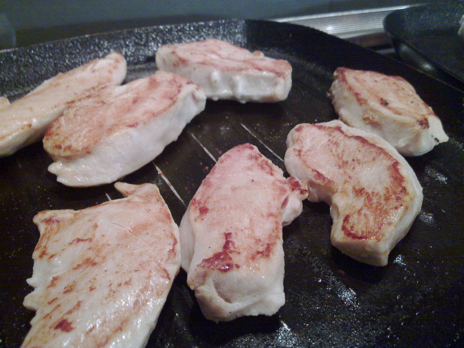2. Las pechugas de pollo se cortan en lonjas de 2,5 cms de altura y se las cuece en plancha bien caliente.
