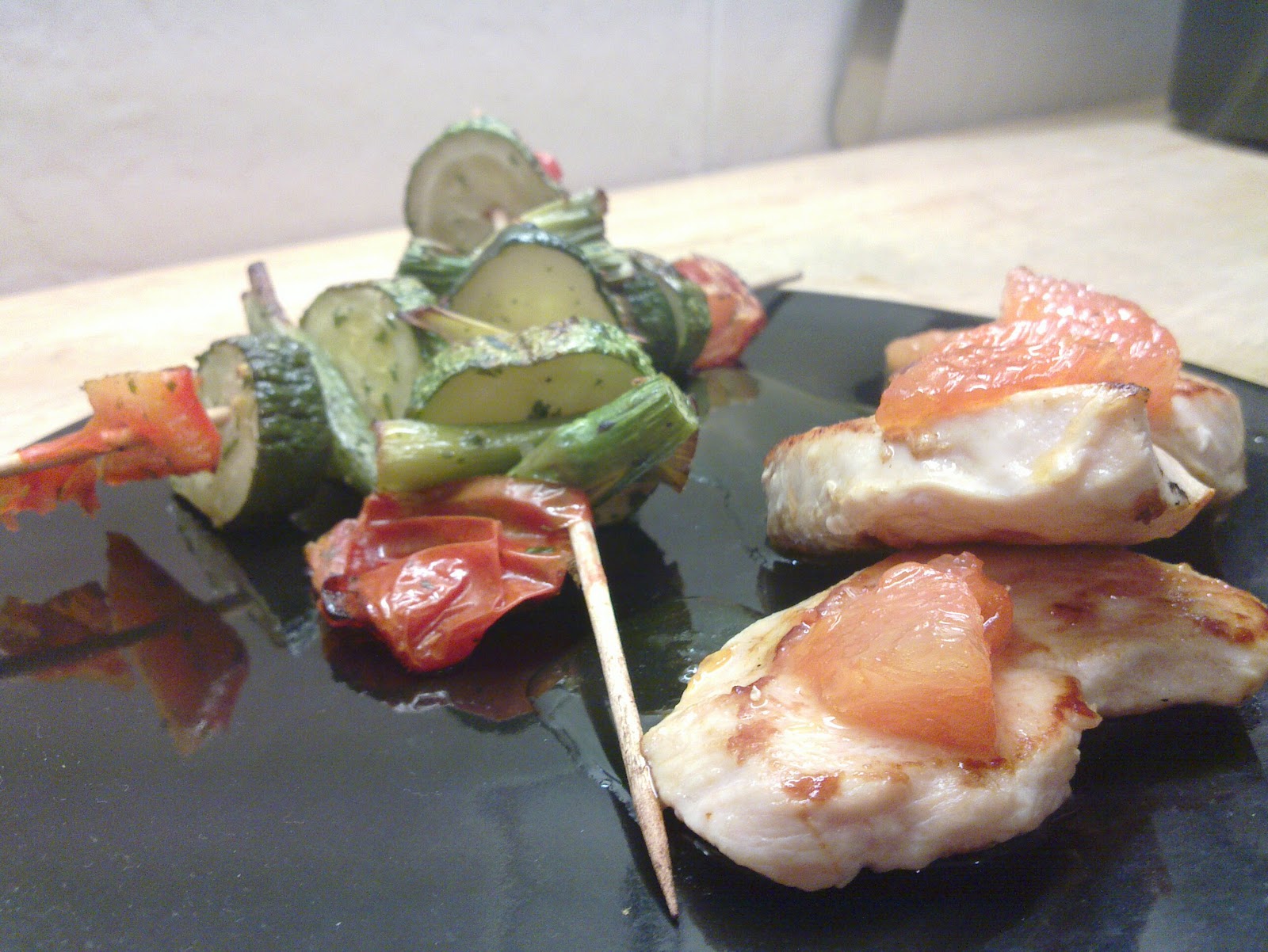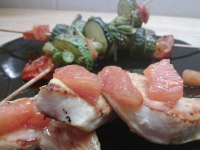 Lomitos de pollo con almíbar de miel, pomelo y jengibre. Brochetas de verduras