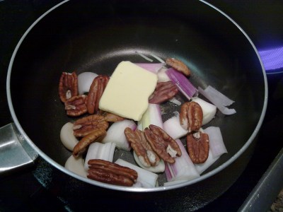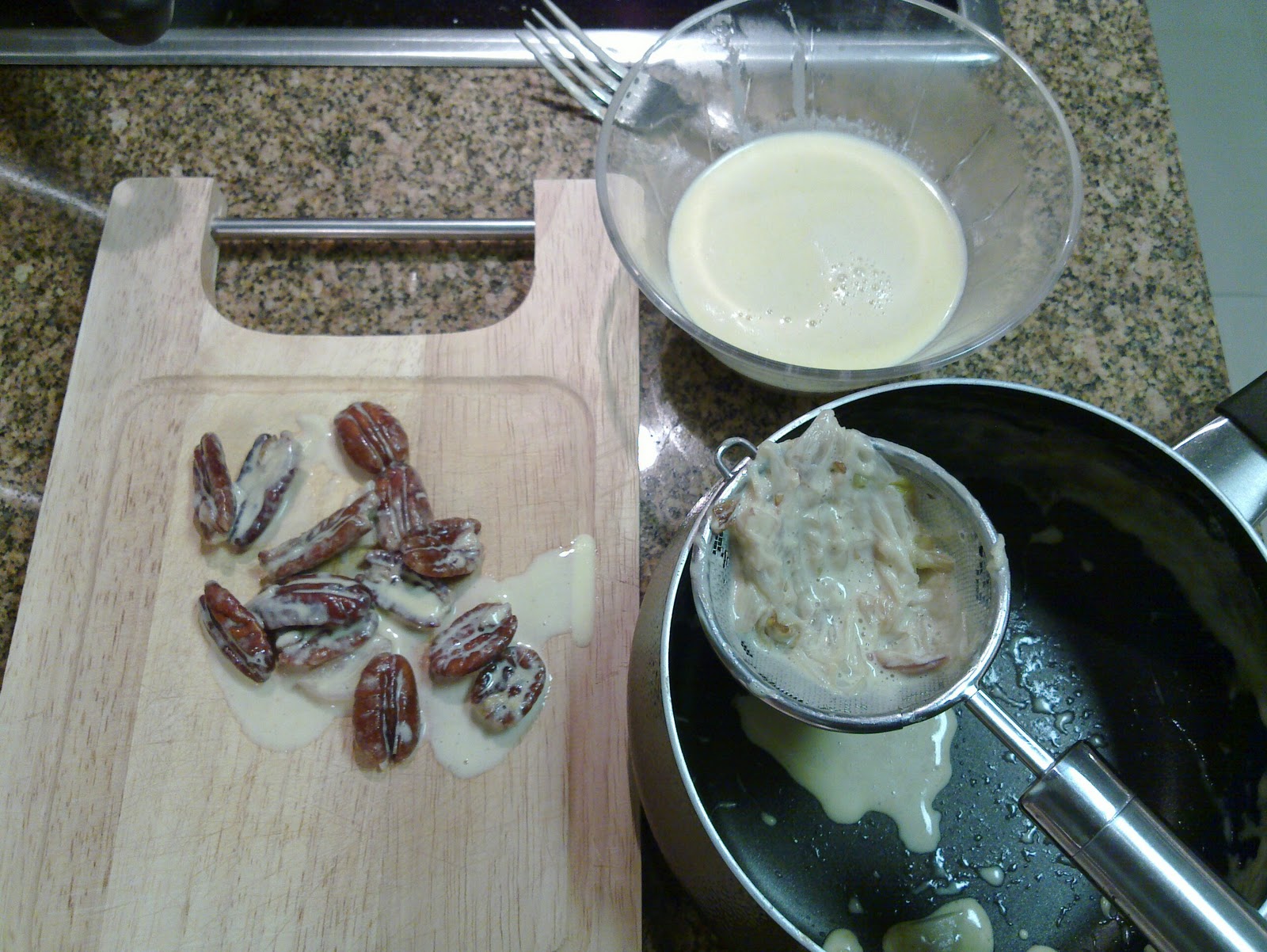 2. En una sartén chica, se realiza el almíbar con el jugo del pomelo colado, el agua y las cucharadas de miel. Se agrega el jengibre y se lo deja reducir. Cuando ya se ha espesado el almíbar se agrega la manteca, muy de a poco. Se agregan dos gajos de pomelo. Se reserva.