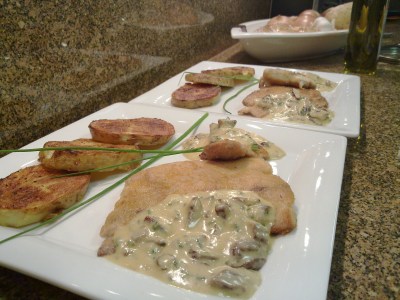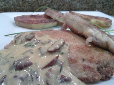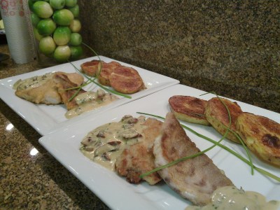 Corvina negra en crema de nueces de pecan con papas al horno