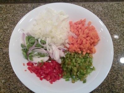4. En una olla a parte, se saltean todas las verduras que se encuentran cortadas en brunoise, en su orden. Primero las zanahorias, luego el ají, la cebolla y finalmente el ajo y el verdeo. Una vez que todas las verduras se hayan transparentado, se agrega el tomate. Se rectifica de sal y pimienta.