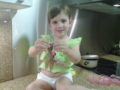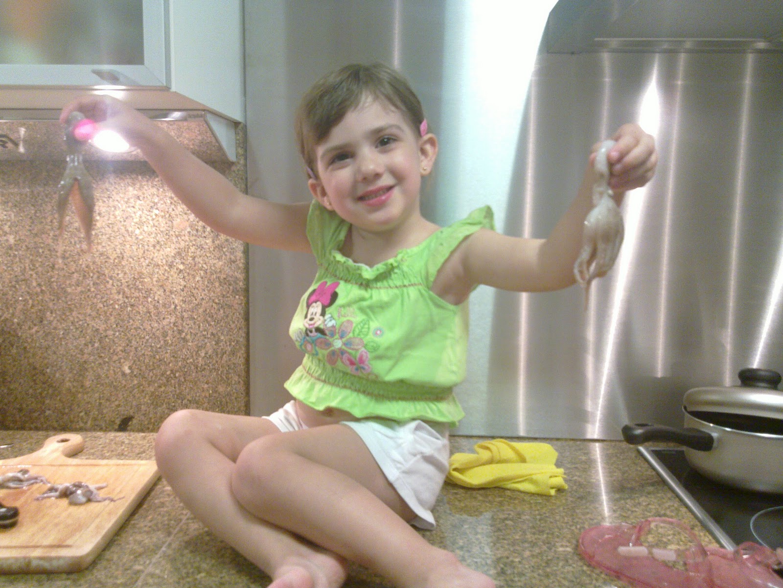Beta, ayudándome a cocinar y haciendo de estrella con los pulpitos: