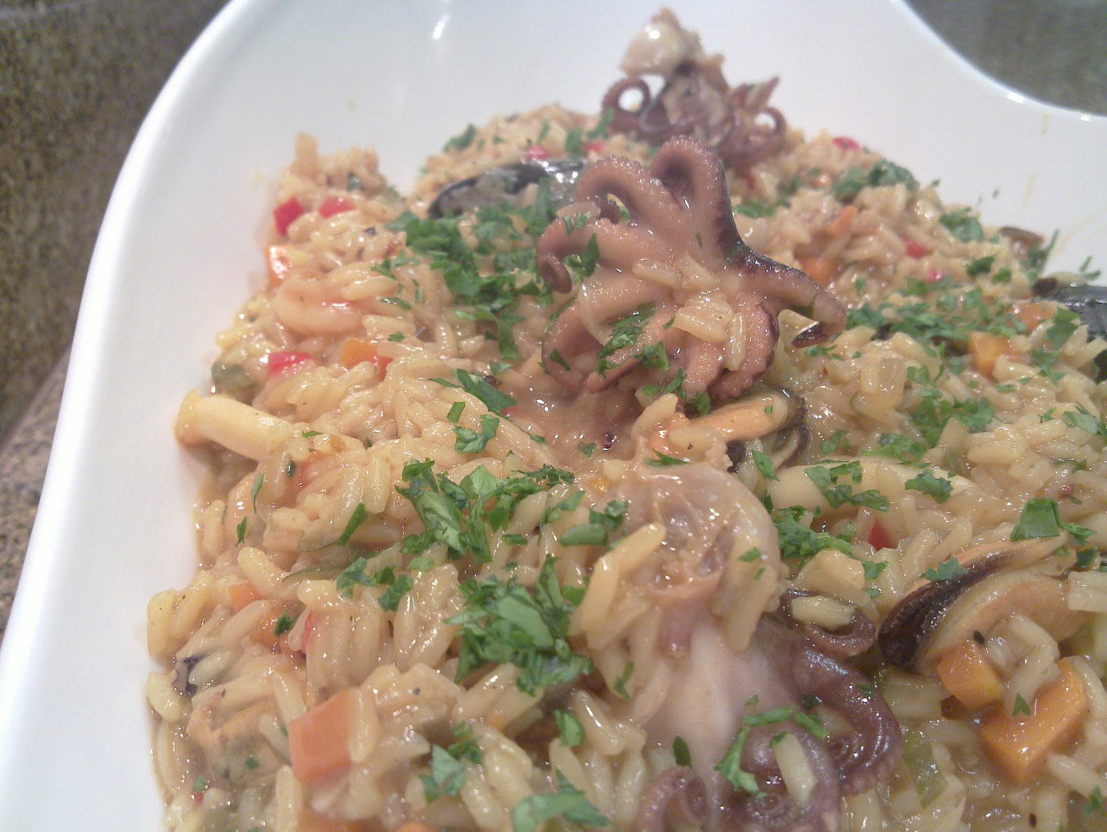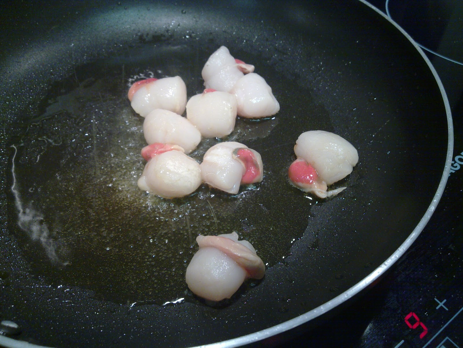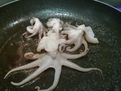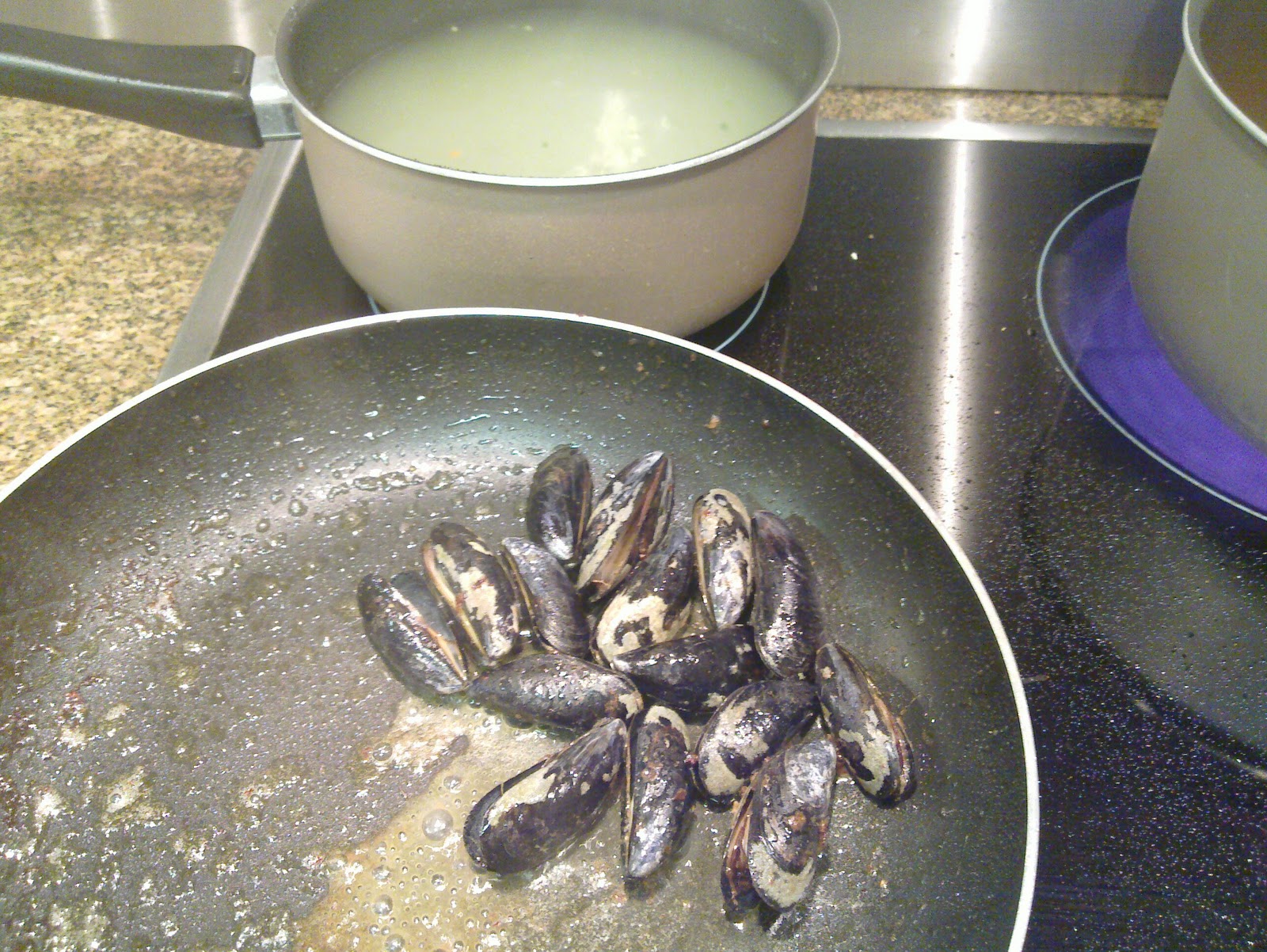 2. Los mariscos se saltean en sartén, con aceite de oliva bien caliente, por espacio de 1 minuto cada uno. Comenzamos por las vieyreas, los langostinos, las rabas, los pulpitos y por último los mejillones. Cada uno de ellos, fue dejando en la sartén todos sus jugos.