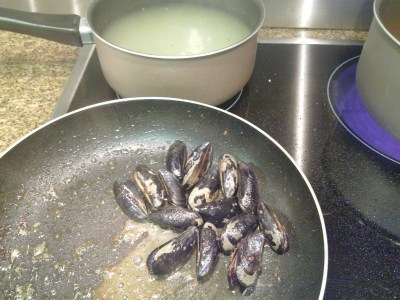 3. En esta misma sartén, cocinaremos los mejillones vivos, que deben estar bien cerrados. Se los agrega a la sartén bien caliente y se le agrega un poco de caldo para que se cocinen. Al minuto, se los tapa y se los deja reposar hasta que se abran. Se descartan las piezas que permanezcan cerradas. Se reservan todas las piezas.