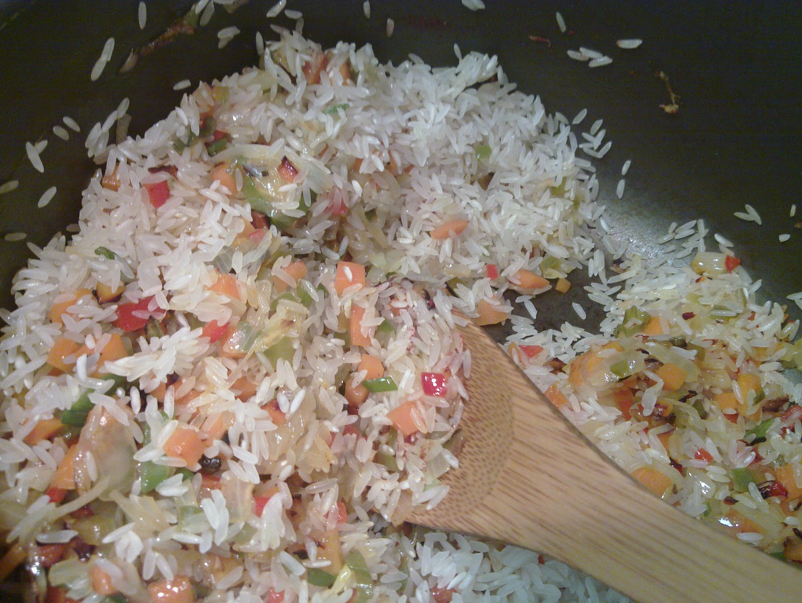 5. Cuando todas las verduras están listas, se agrega el azafrán y todo el arroz, con el objetivo de saltearlo y transparentarlo. Luego, se agregan todos los jugos que quedaron en la sartén donde se sellaron los mariscos.