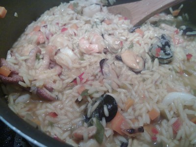 7. Ya finalizando el punto se agregan los mariscos y un poco de queso de rallar. Como todo risotto, debe reposar, con el agregado de un poco más de aceite de oliva.