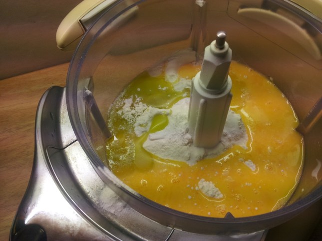 1. Siempre me gustó utilizar la procesadora para ligar la masa de la pasta. Esta vez no será la excepción. Primero incluímos los secos, harina y sal. Luego, los huevos y el aceite. El agua es para regular obviamente la humedad de la masa.