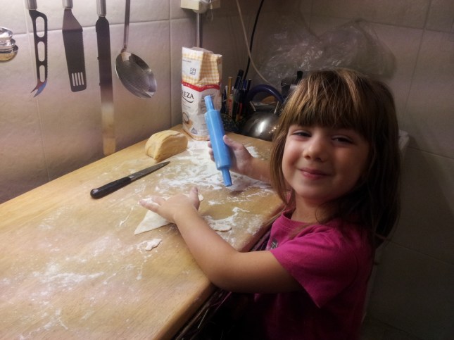 3. Para estirar la masa yo uso la pasta linda, desde siempre. Es bastante eficaz y para casa anda bien. Con la colaboración de mi ayudante pudimos estirarla, comenzando desde el punto 1 hasta el punto 7, con dos pasadas por punto hasta obtener una masa lo bastante fuerte como para resistir amoldarse a un relleno.