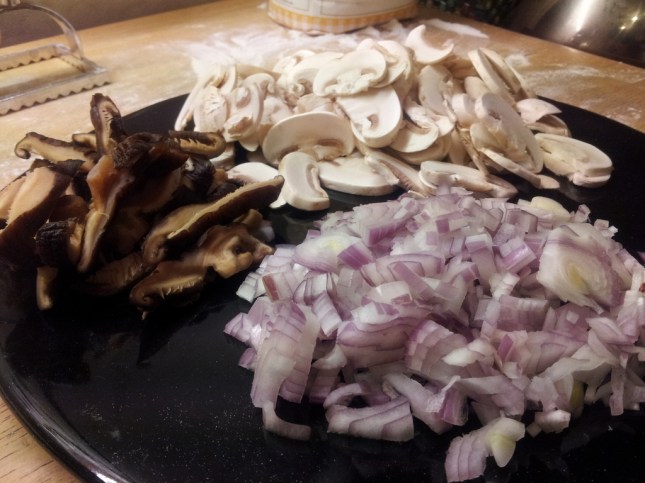 1. Picar la chalota muy fino. Los champignones en láminas y los shiitakes en laminas gruesas. Dorar en manteca la chalota hasta que transparente, sin agregar sal.