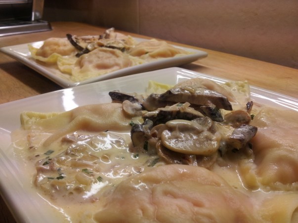 Raviolones caseros de calabaza y queso con crema de hongos