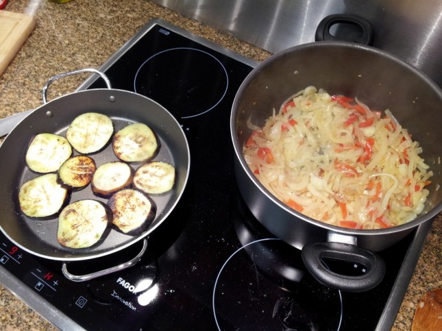 2. Dorar en una sartén todas las berenjenas, de ambos lados, con aceite de oliva y sal marina. Reservar.