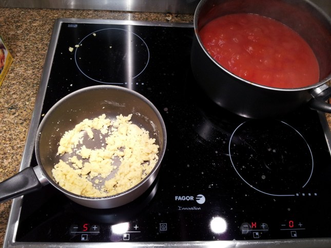 2. Agregar el tomate triturado. Una vez que hierva la salsa reducir el fuego a medio, por media hora para que se cocine la salsa. Rectificar los sabores y dejar enfriar.