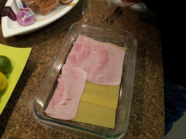 2. Cubrir la pasta con el jamón cocido de manera uniforme. Cubrir con una capa de pasta.