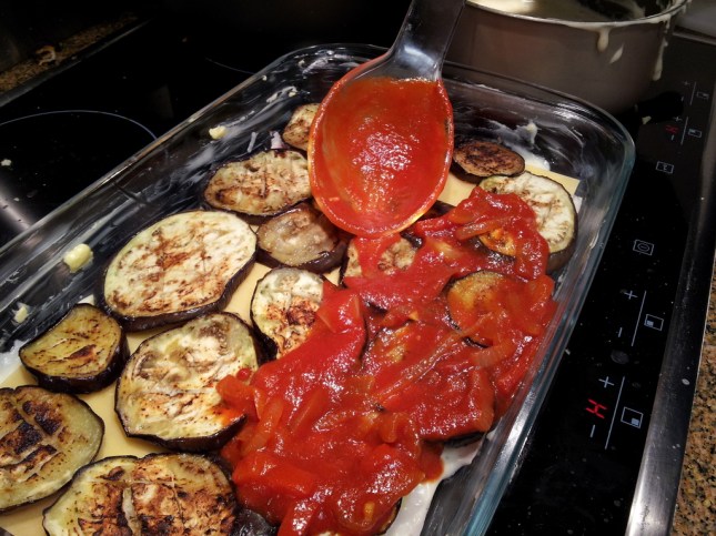 3. Agregar las berenjenas y cubrirlas con una capa de salsa de tomate. Agregar un nuevo piso de pasta.