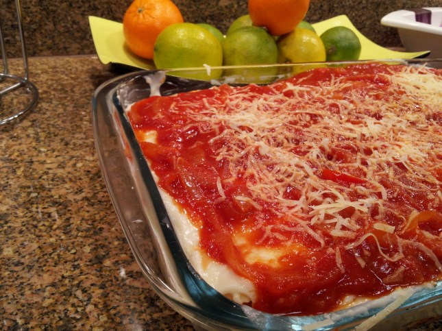 1. En una fuente de vidrio para horno, colocar una fina capa de salsa de tomate. Agregar una capa de pasta de lasagna.
